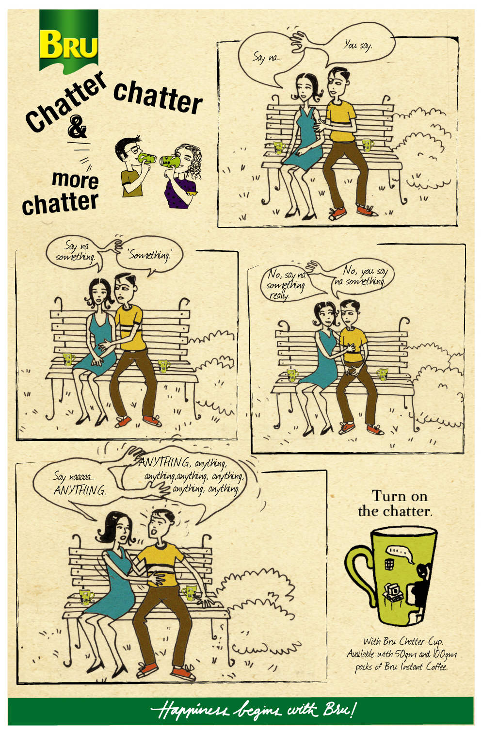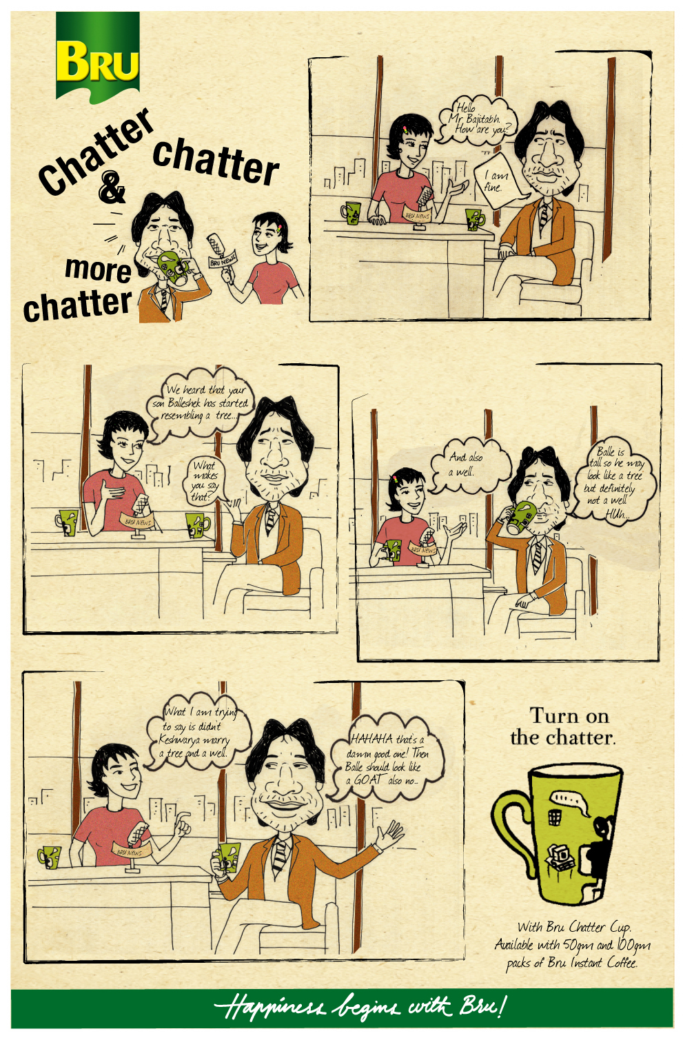 The objective of this campaign was to promote the Bru Chatter Mug which would be sold alongside 100gm to 50gm Bru Coffee packs. The fun illustrations depict the senseless, fun and laughter filled chatter one enagages in once the coffee is consumed from the chatter mug. The mug is also designed with these fun illustrations.