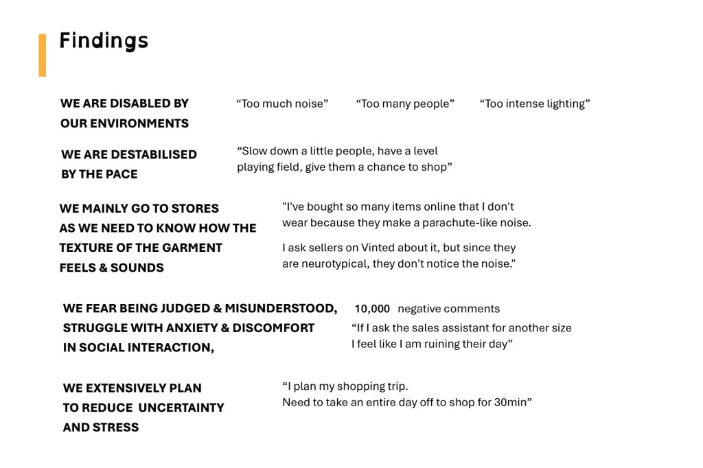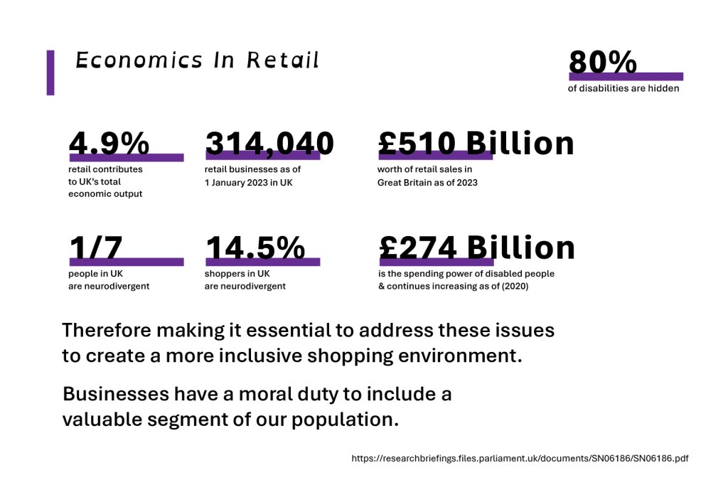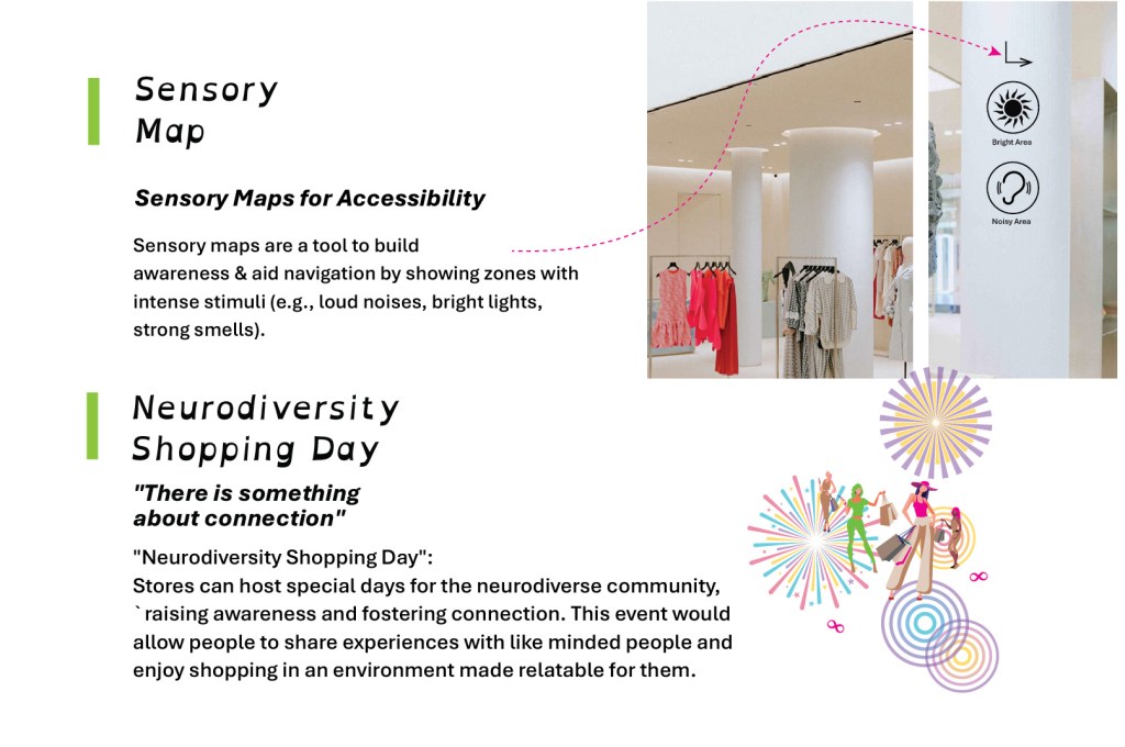 This approach revealed that inclusive design not only drives meaningful social change but also creates tangible business value. As retail evolves to prioritise accessibility and enhance in-store experiences, Our project emphasises diverse needs, promoting a more equitable society, and highlights the important role brands can play in advocating for social causes like neurodiversity, which is crucial for improved business outcomes.