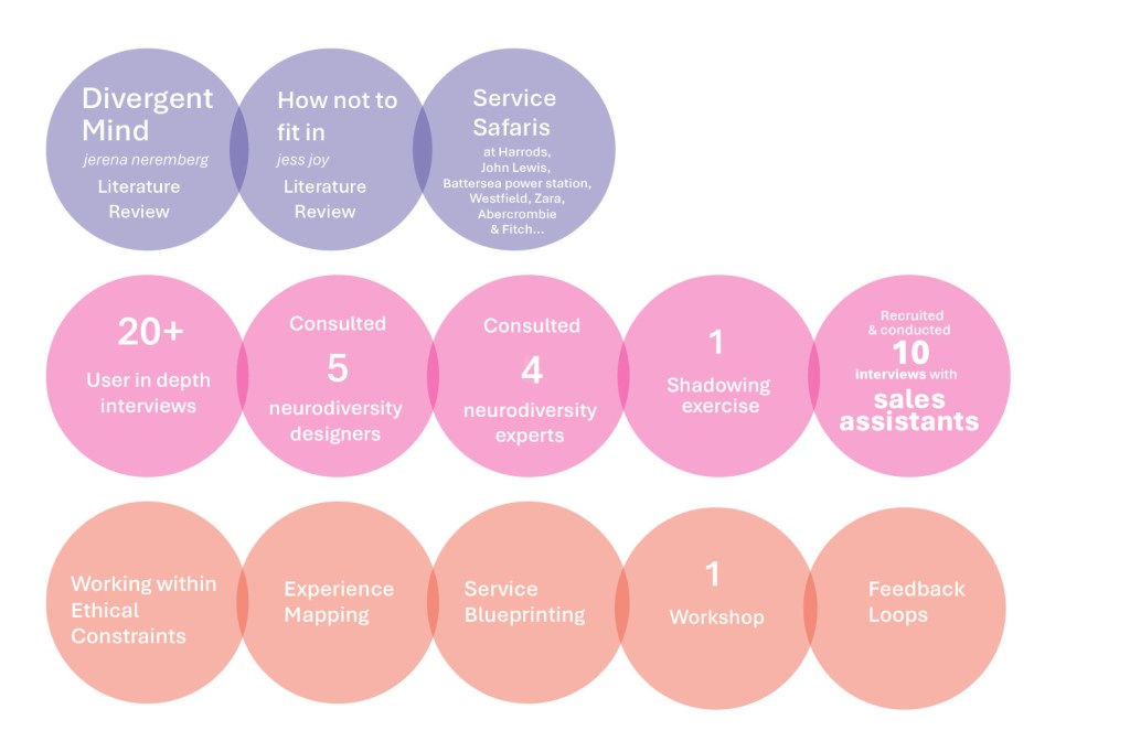 For my Independent Research Project at the Royal College of Art, London, I set out to advance inclusive design in retail-focusing on the often-overlooked needs of neurodiverse customers. By stepping into the shoes of a sales assistant and using ethnographic methods like service safaris and shopping shadowing, I uncovered barriers that affect all shoppers, not just the neurodiverse. Co-creative workshops with neurodiverse participants deepened these insights, leading to the development and testing of a service blueprint that made retail experiences more intuitive and accessible for everyone.