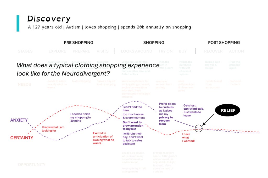 Framed the design challenge around inclusive retail for neurodiverse customers, balancing user needs with business value. Embedded on-ground as a sales assistant to gain operational insight and identify systemic barriers.