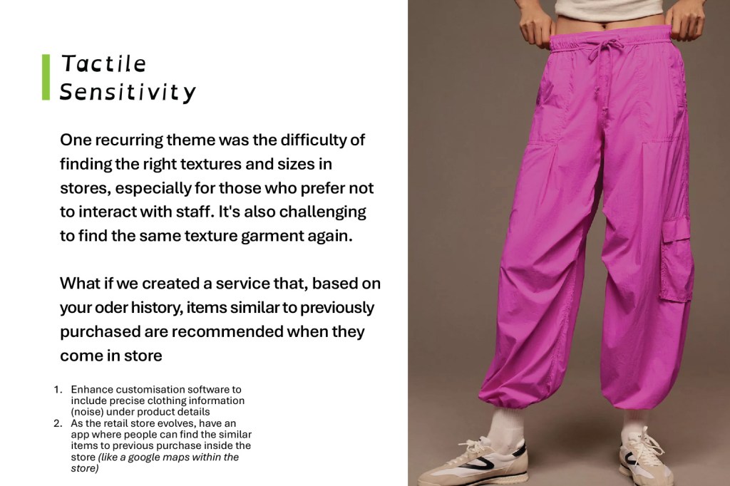 • In-person shopping remains essential for many neurodivergent individuals, especially due to needs like texture sensitivity and assurance of garment size and colour — experiences that cannot be fully replicated online.