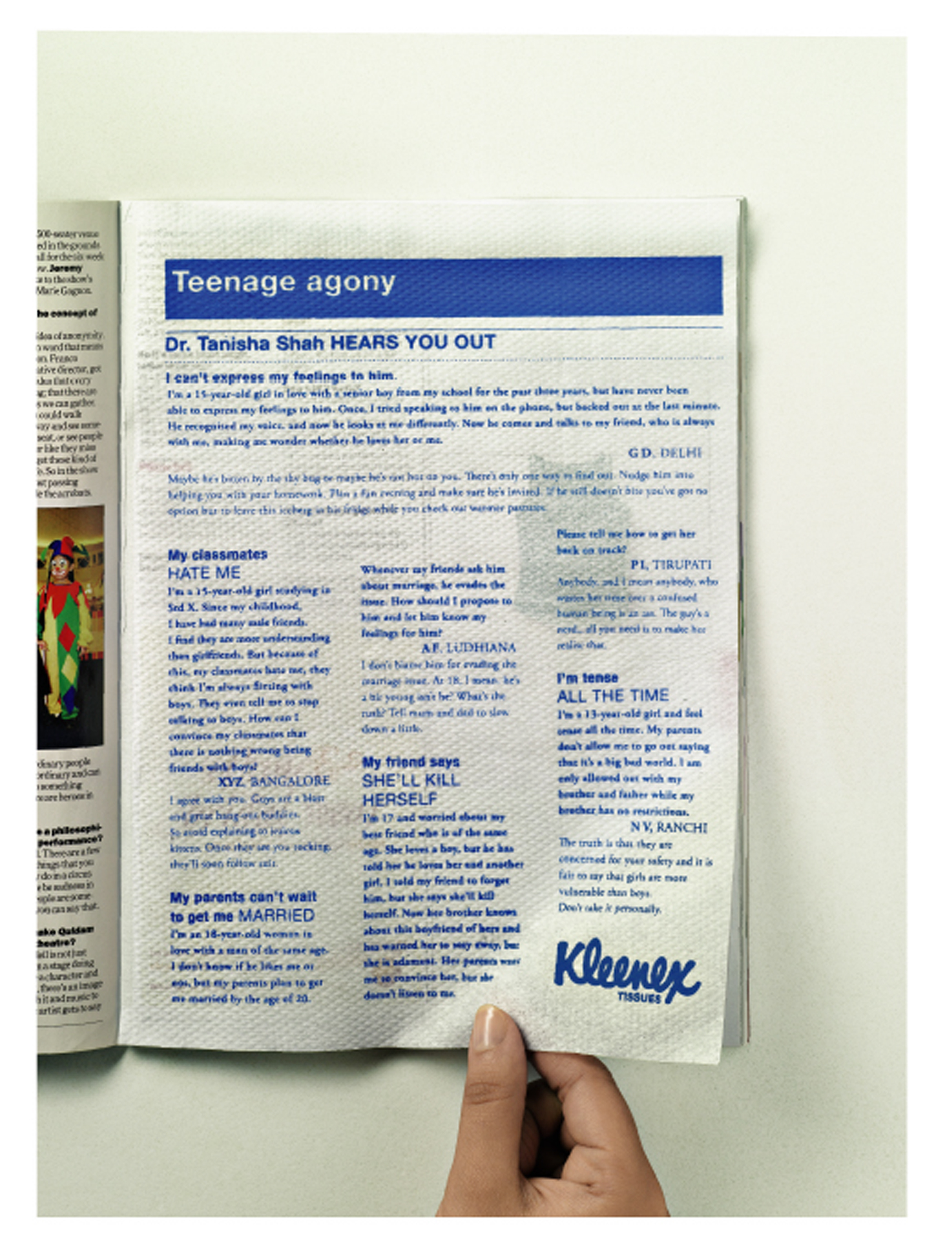 The Teenage Agony Aunt page of a popular magazine was printed in Kleenex Tissue.